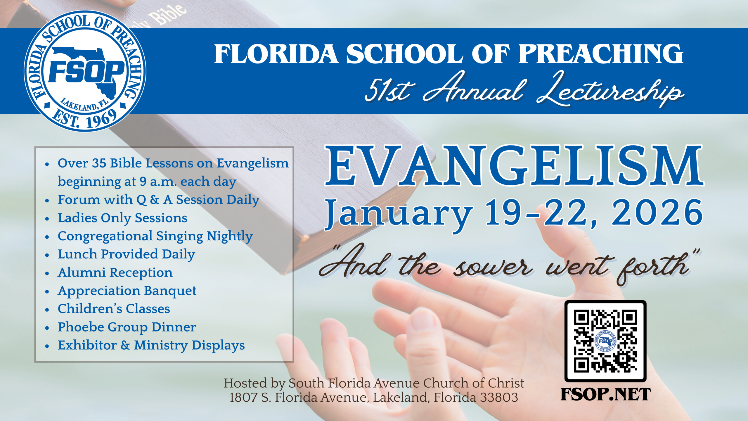 Here are resources for the 2025 Bible Lectureship at the Florida School of Preaching. We encourage you to take full advantage of every opportunity this year’s lectureship provides, and we pray it will be a source of blessing and encouragement to you. Feel free to use these resources to promote the upcoming Lectureship and share its message with others.